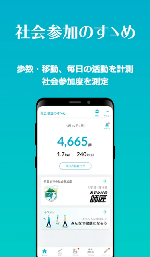 ⇒The Social Participation Report allows you to check changes in your own behavior based on objective information such as the number of types of places you go out and changes in the number of days you go out. Please try it for 1-2 months and wait for the report to be distributed.