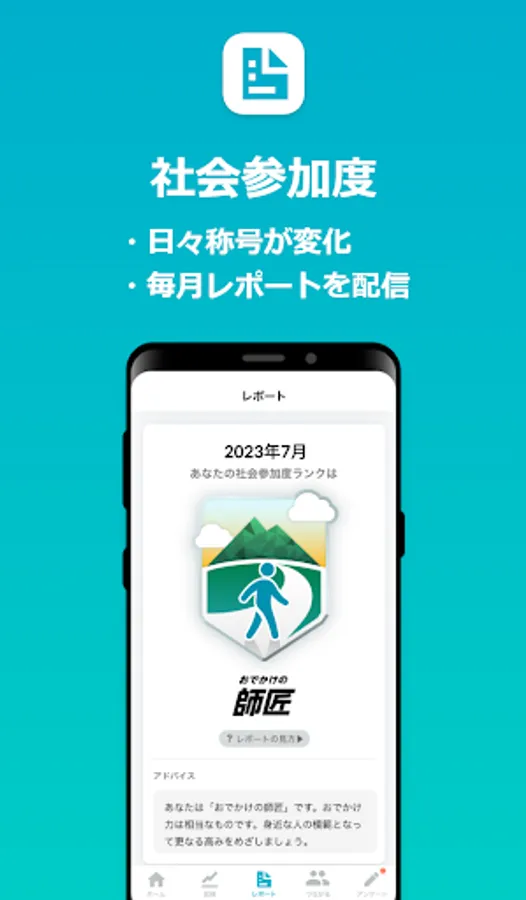 At the beginning of every month, we will deliver a report looking back on the previous month, and announce titles and advice based on your level of social participation. The title is determined by the number of indicators that exceed the standard value out of three indicators: ``average number of steps,'' ``number of types of places stayed,'' and ``number of days spent outside.''