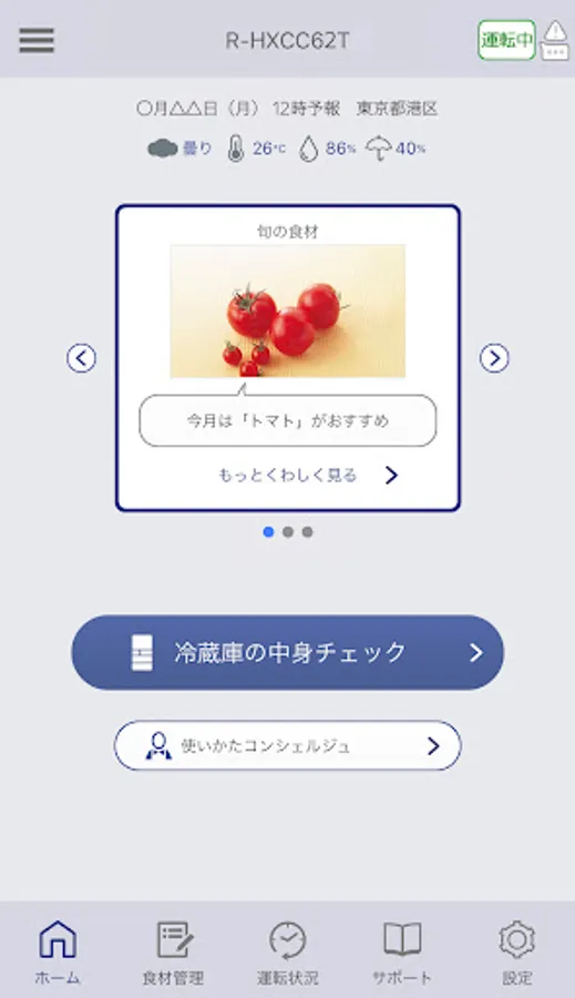 We will inform you of useful information such as "seasonal ingredients" information according to the season, "shopping recommendation index" that displays the degree of recommendation to go shopping according to the weather forecast, and "refrigerator operation status".
