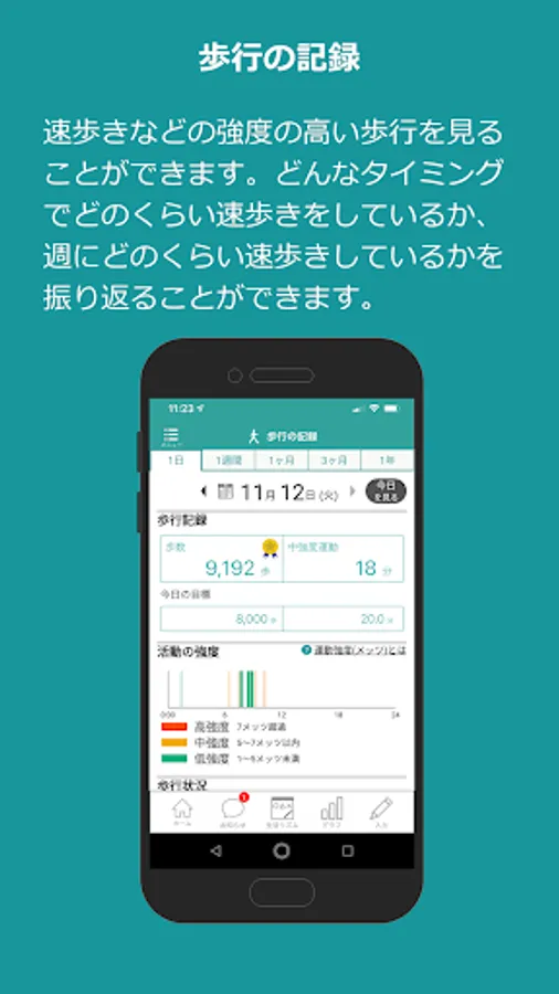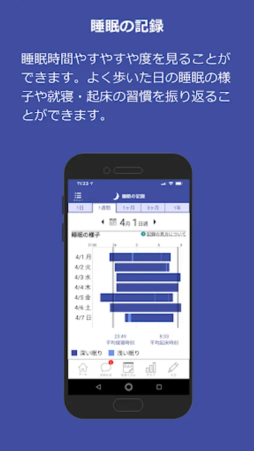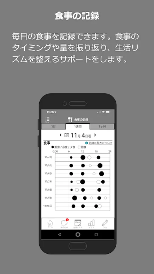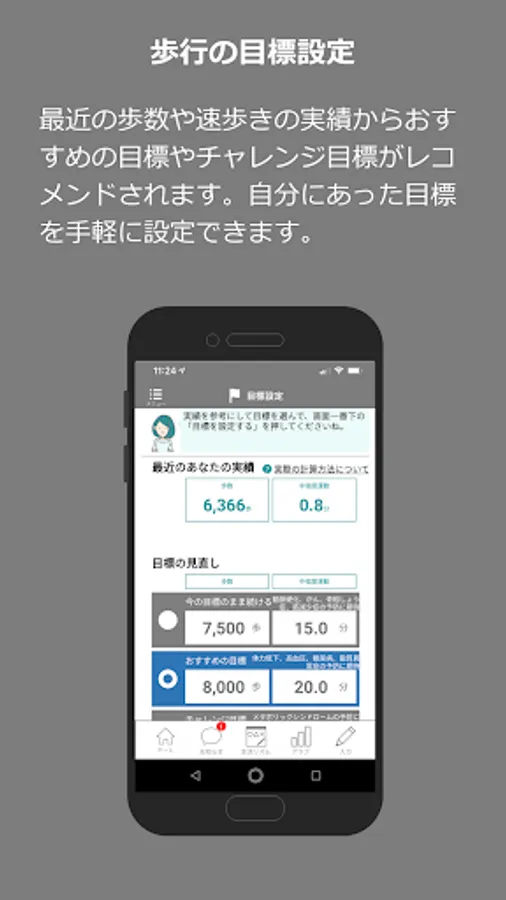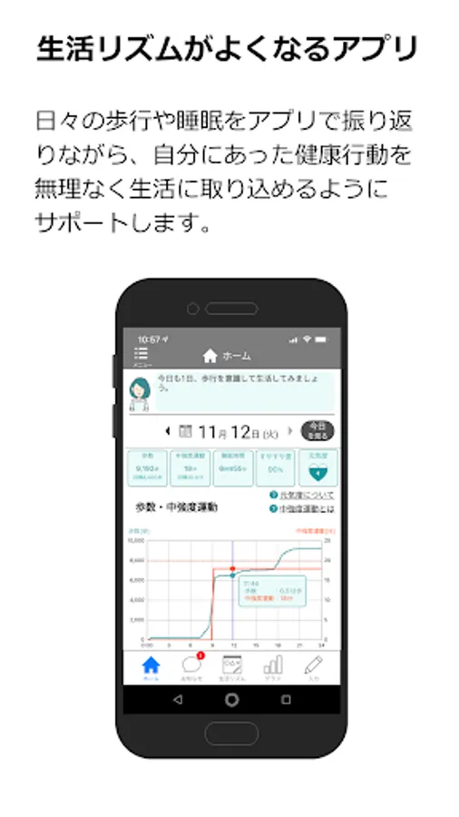 "App that improves your daily rhythm" is a smartphone app that allows you to record and look back on walking, sleeping, and eating. Goal setting and programs with health coach advice can help you develop healthier actions.