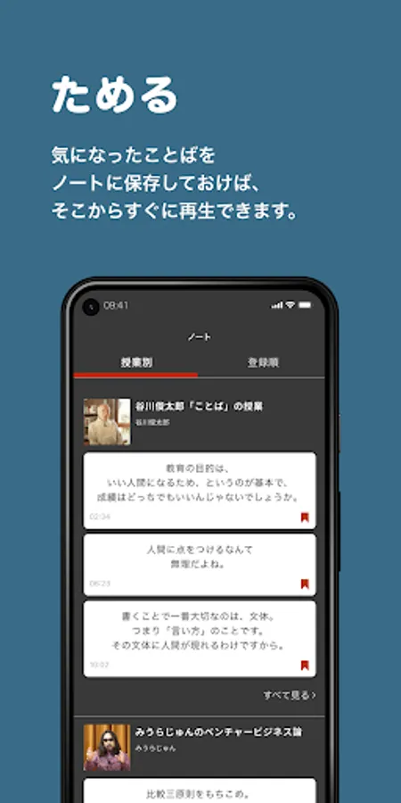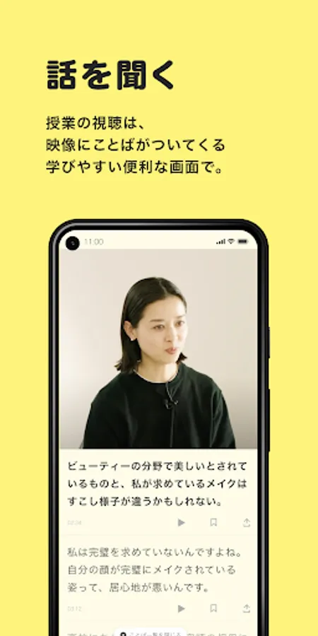 Easy-to-learn and convenient design with "words" attached to the bottom of the video. If you display the words in a list, the words become an index and you can easily play back from the place you want to hear again.