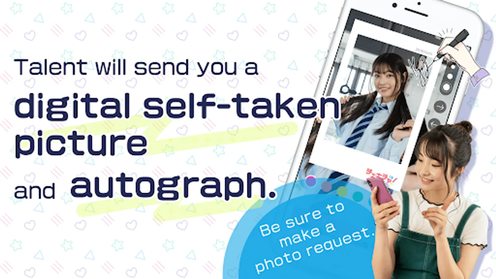You can have video and audio conversations while talents autograph their photos taken on the spot, and you can enjoy communicating just like a privilege party.