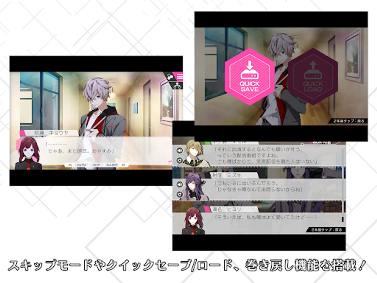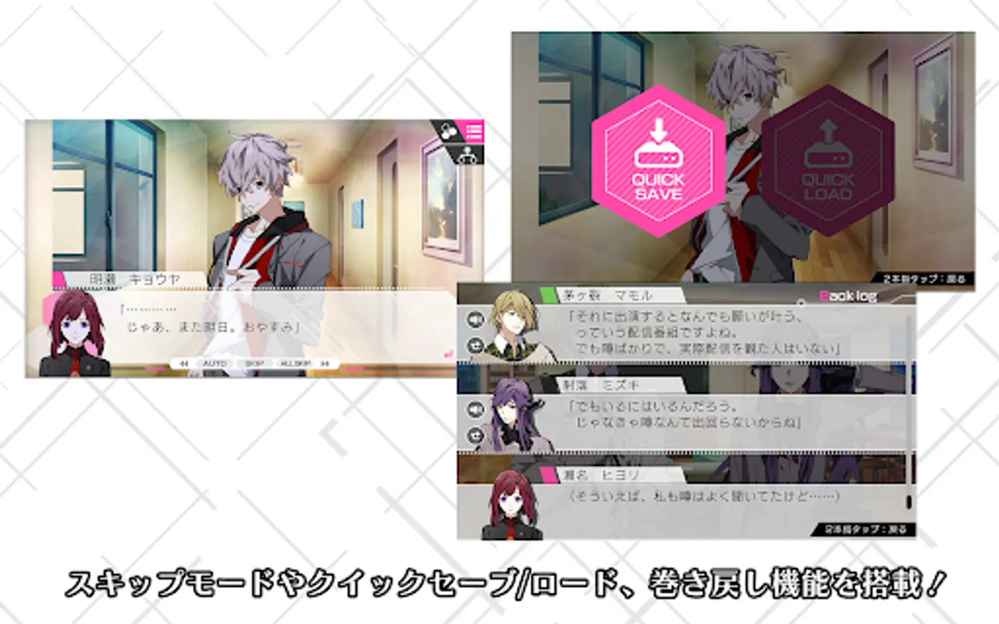 Equipped with a system that allows you to play comfortably, such as quick save/load, read/unread skip, auto mode, backlog, and rewind.