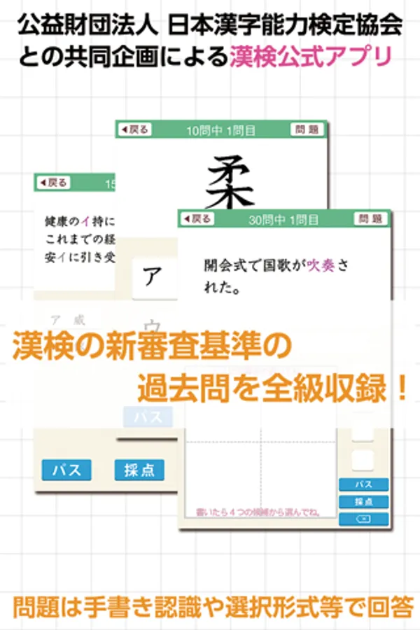 "Kanji Kentei Start" is a Kanji Kentei countermeasure app developed in collaboration with the Japan Kanji Aptitude Testing Foundation.