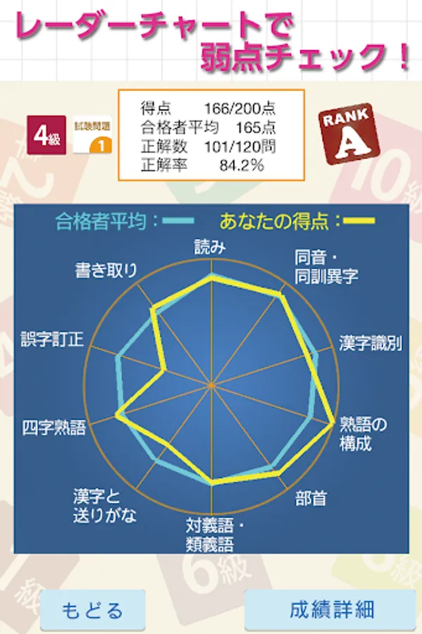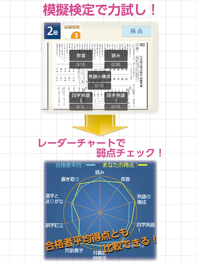 After training in "drill" mode, test your strength in "mock test" mode. Check for weaknesses on the radar chart! You can also compare your score with the average score of successful applicants!