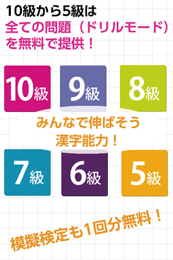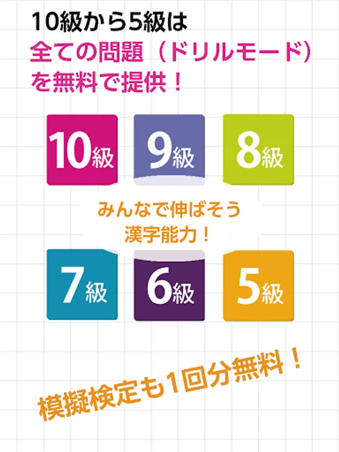 For the purpose of "providing an environment where it is easy to learn Chinese characters", you can study about 8,000 questions of grades 10 to 5 (only in "drill" mode) for free. The "mock test" mode is also free for one time, so you can test your strength!