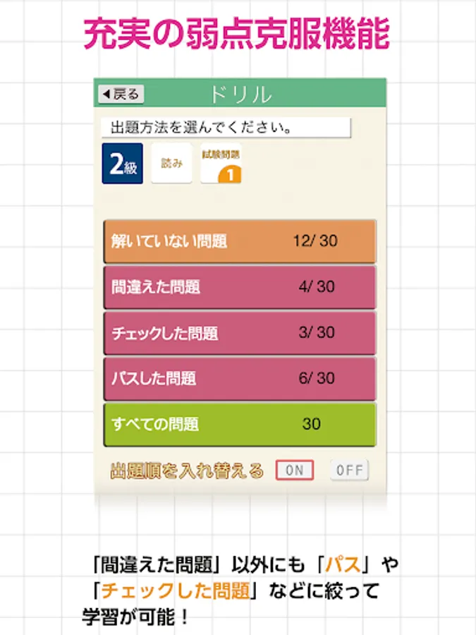 Equipped with a full range of weakness overcoming functions. You can study not only the wrong questions but also the "pass" and "checked" questions.