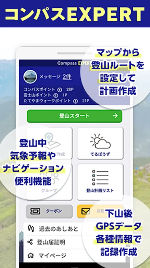 Compass EXPERT supports everything from creating mountain climbing notifications to using them during mountain climbing and organizing mountain climbing records.