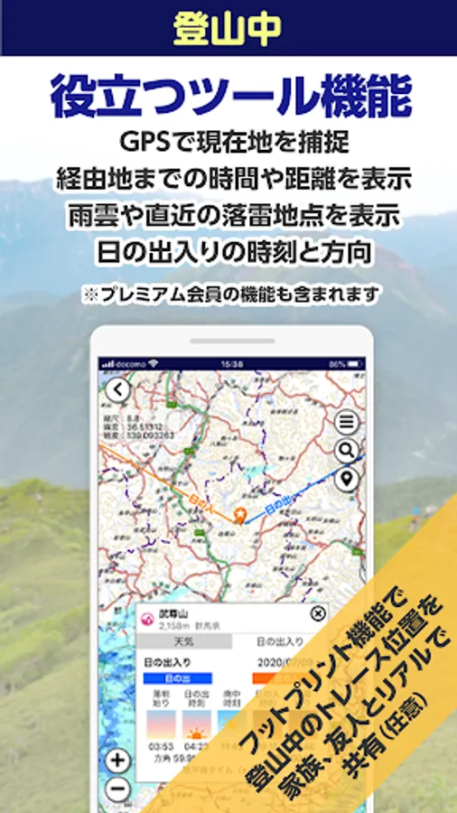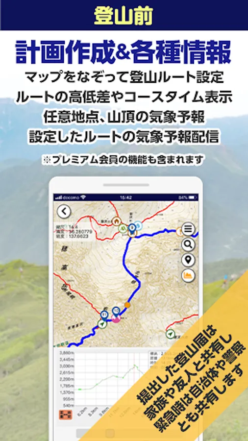 ● Premium service (paid registration) can be used on the "Mountain and Nature Network Compass" app and website.