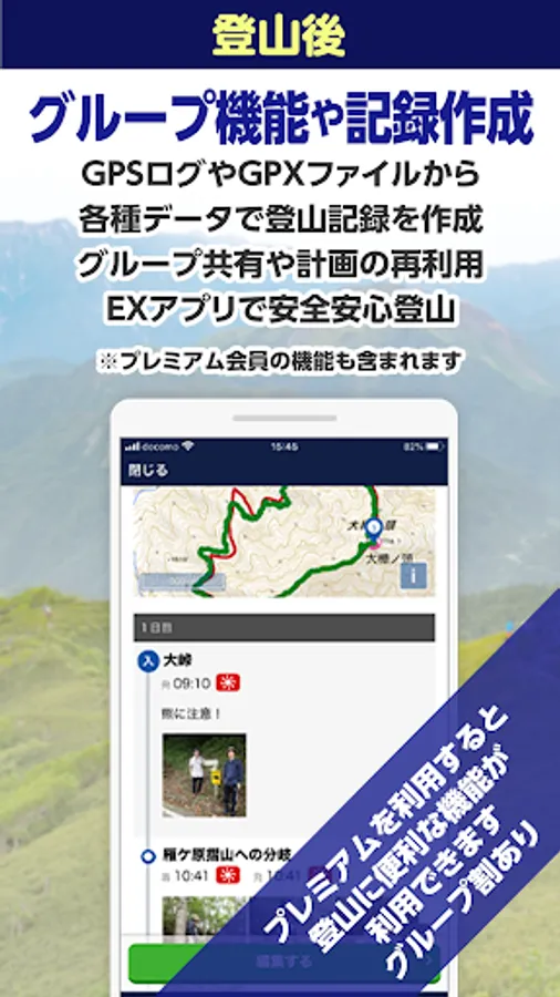 We provide functions and services that are useful for the safety and security of mountain climbing, such as the function of setting a mountain climbing route, various information attached to the created route, the function of organizing plans after mountain climbing, and the function of sharing with group members.