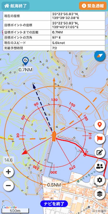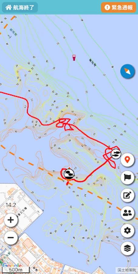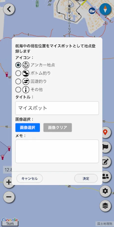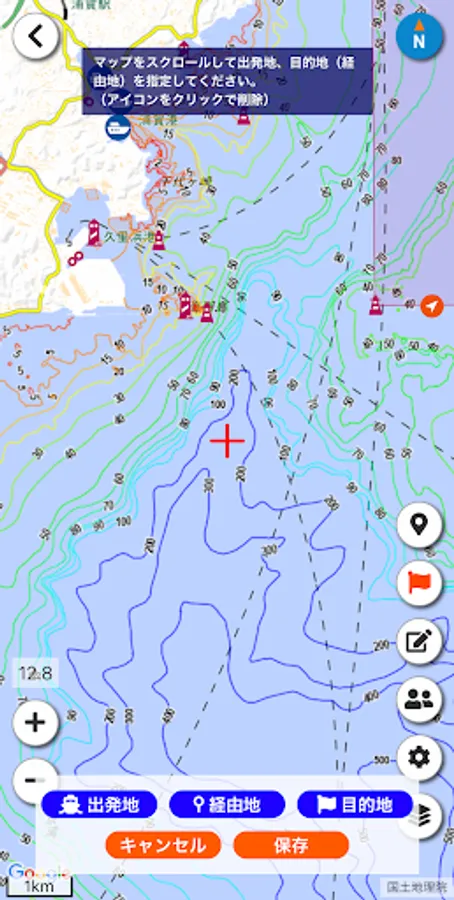 Various information such as coastal facilities, fishing areas, buoys, and contour lines are displayed on the map screen of the app.