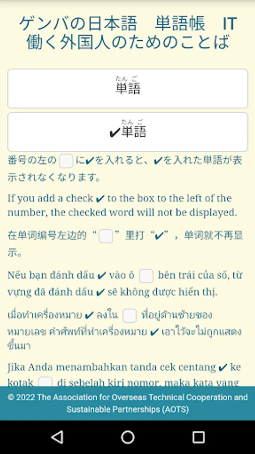 With this App, you can hear all the headwords found in the textbook “ゲンバの日本語 単語帳 IT 働く外国人のためのことば”.