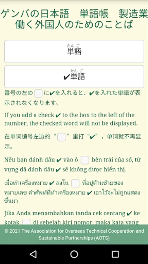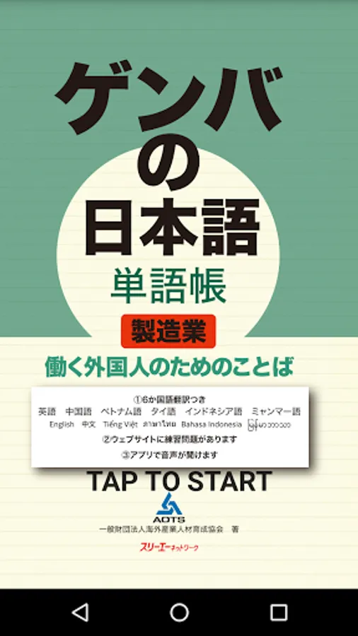 With this App, you can hear all the headwords found in the textbook “ゲンバの日本語 単語帳 製造業 働く外国人のためのことば”.