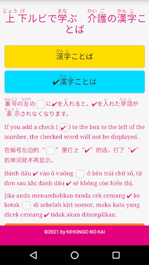 With this App, you can learn the kana readings given above and below the kanji words listed in the textbook “上下ルビで学ぶ 介護の漢字ことば”.