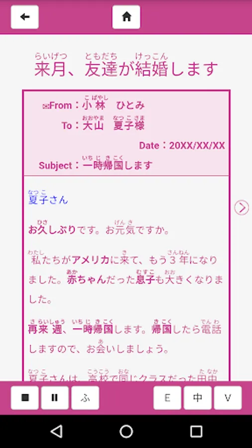 ・“ふりがな ON/OFF” … Turn on or off the phonetic readings of the kanji.