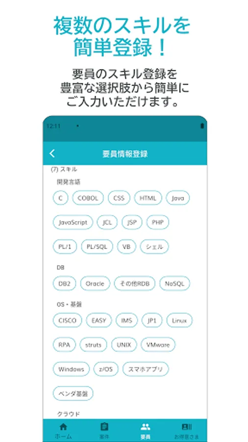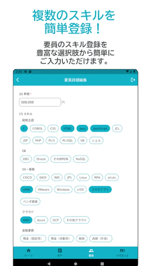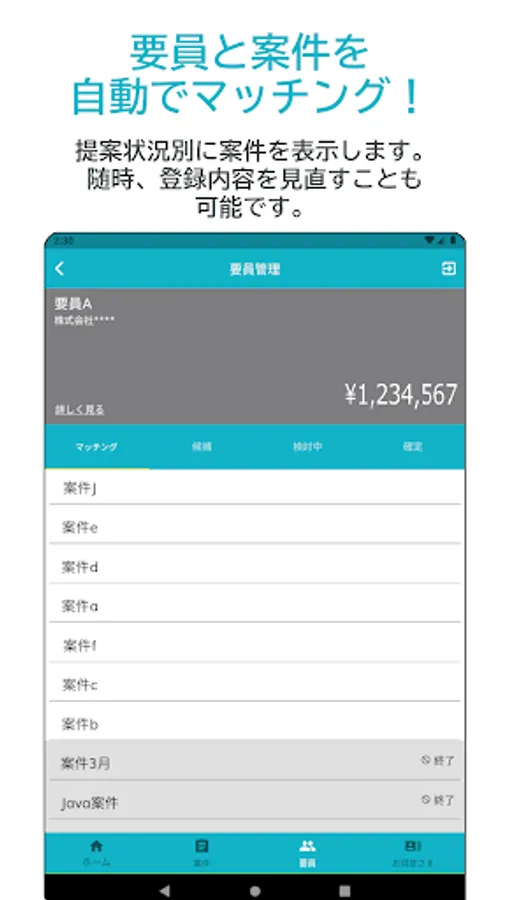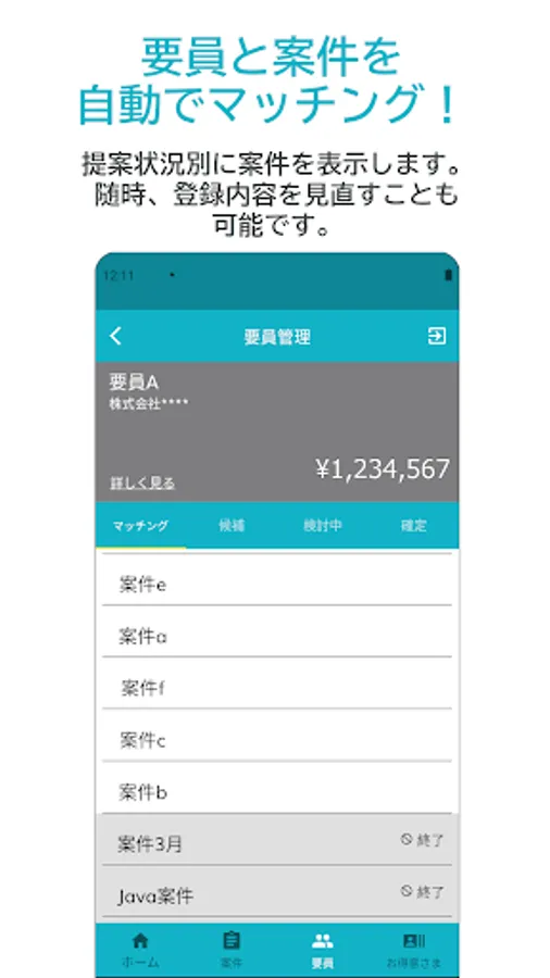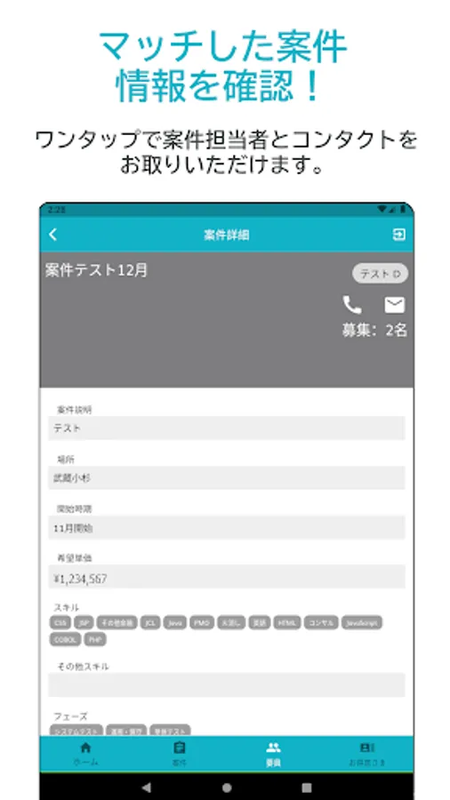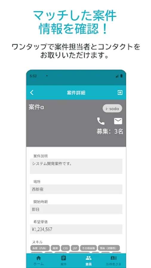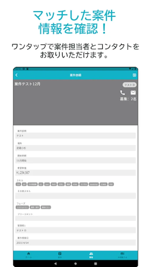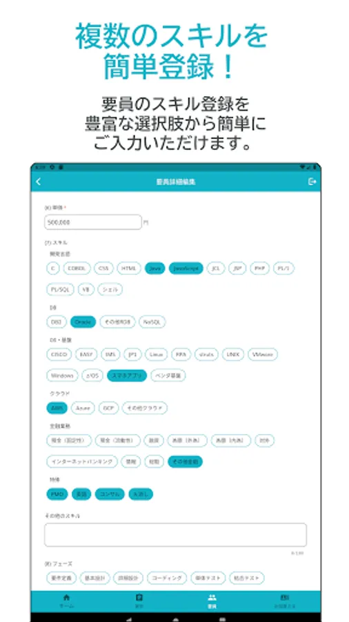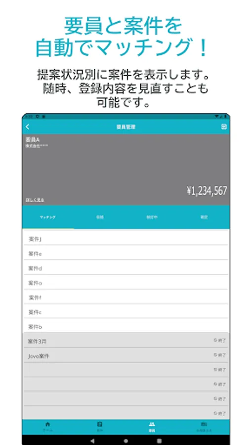 From the app, you can easily propose personnel simply by entering personnel information such as unit price and skills. Items that have a high degree of matching with the personnel will be listed immediately. It is also possible to share personnel with other users.
