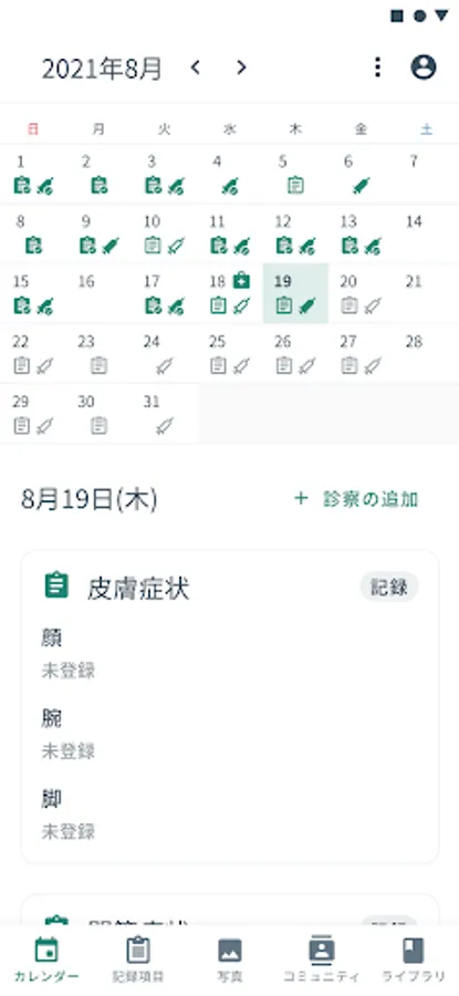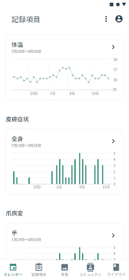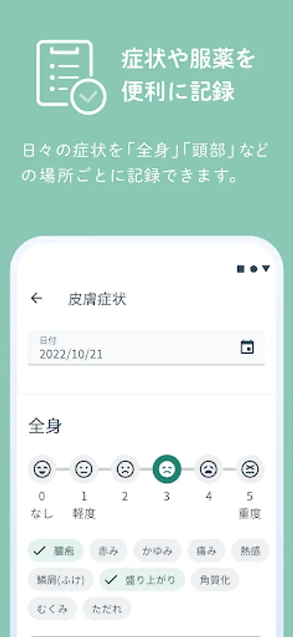 You can record daily symptoms by location such as "whole body" and "head". You can use it at any time, such as entering it all at once later.
