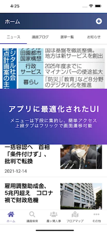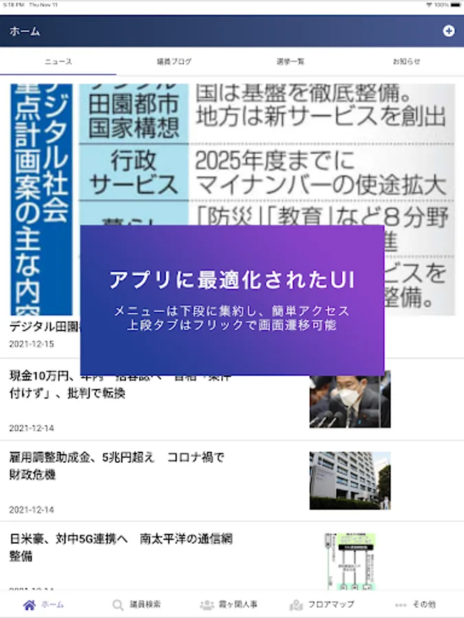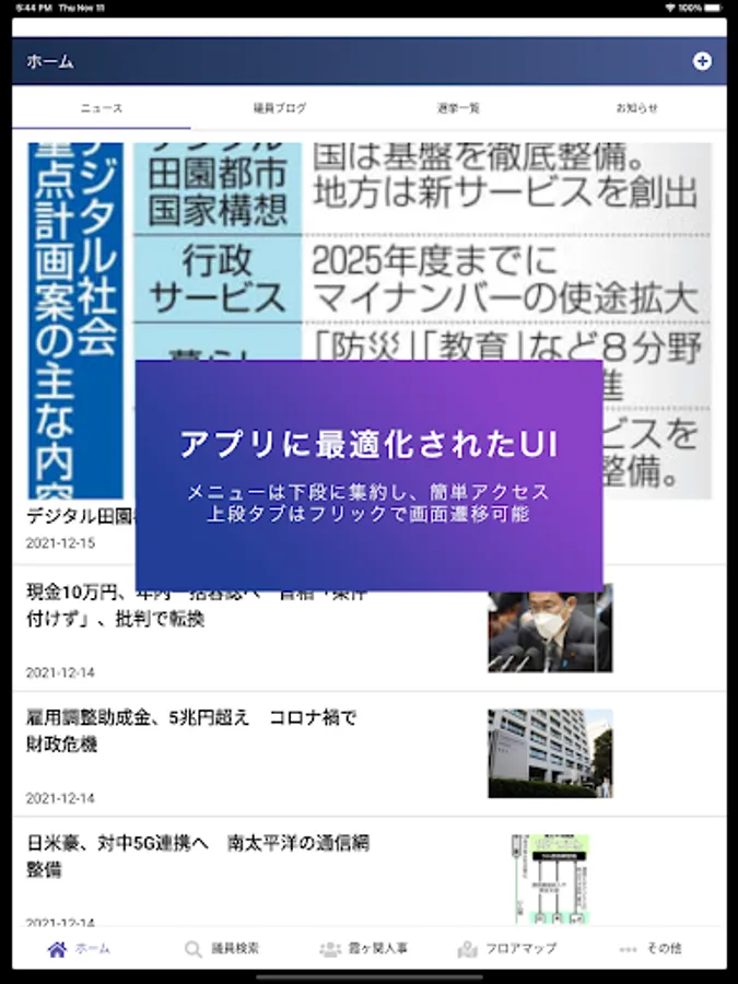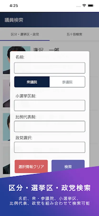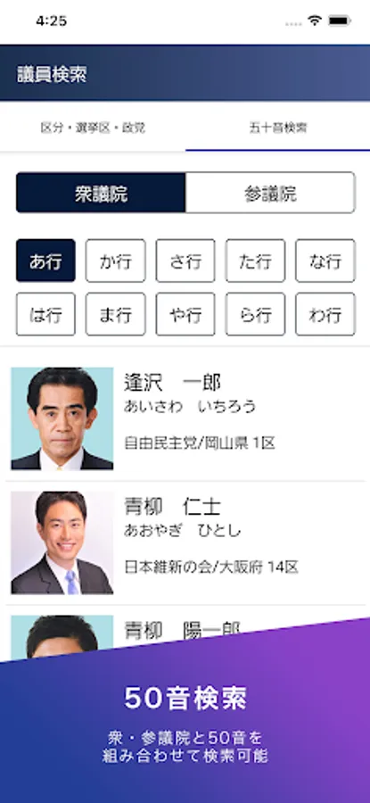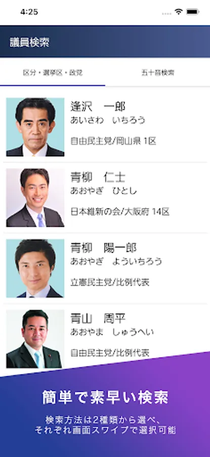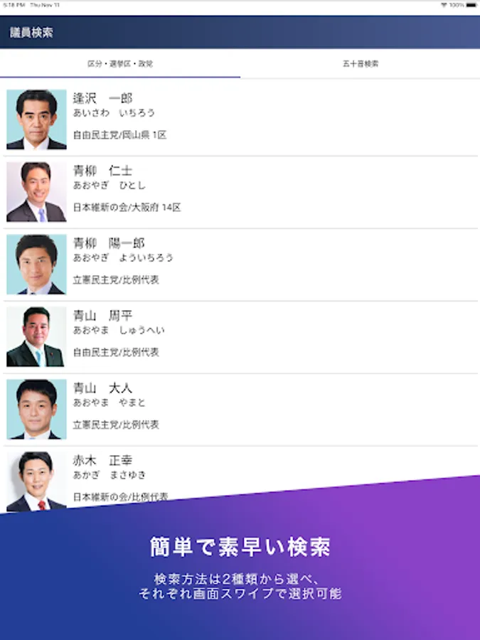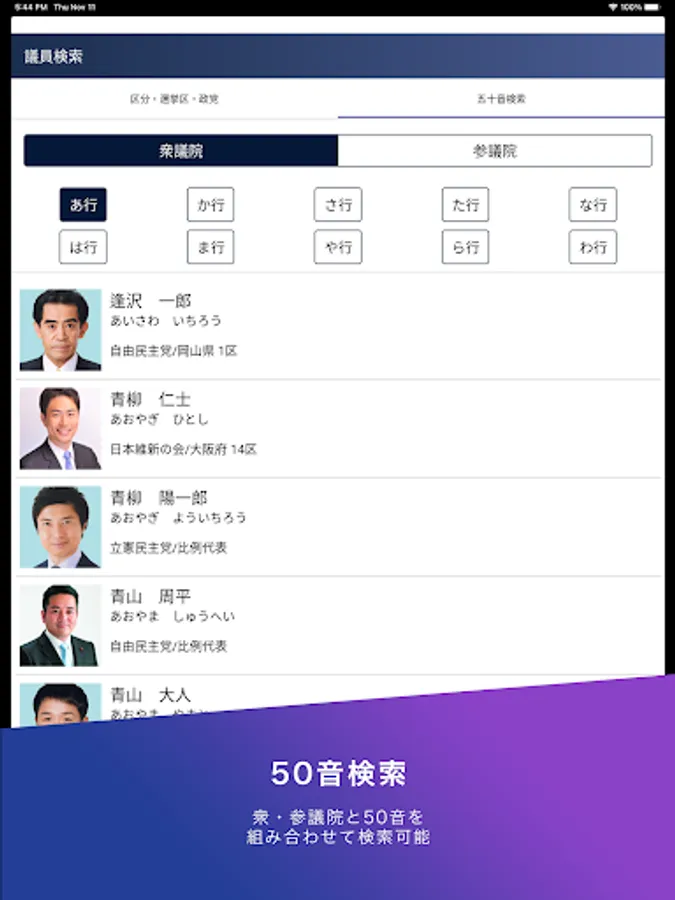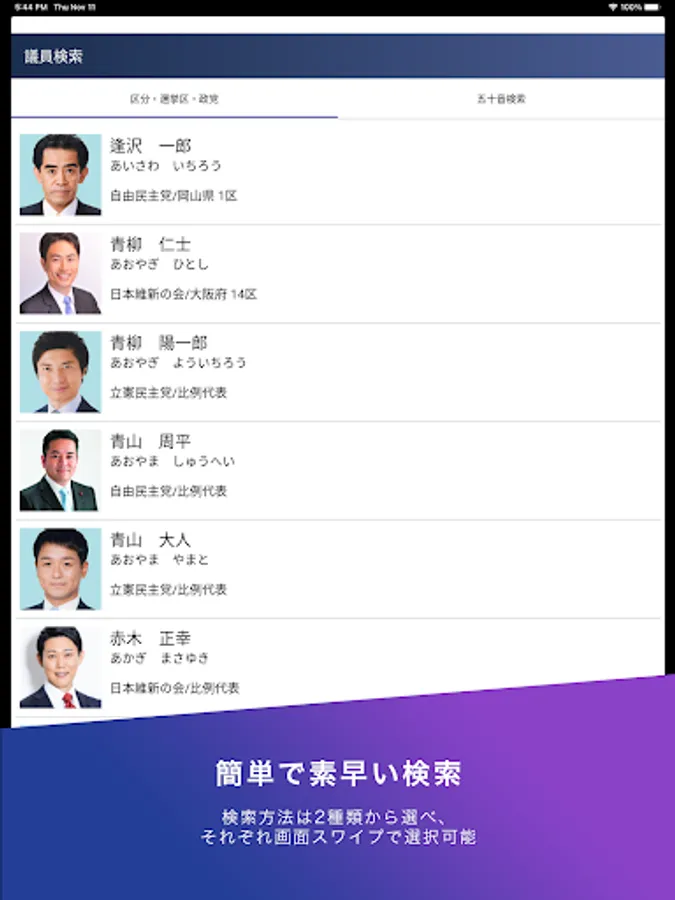 Optimized for smartphone apps, you can flick screen transitions and search for members of the Diet.