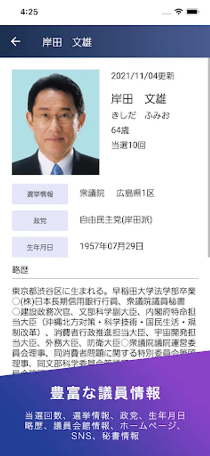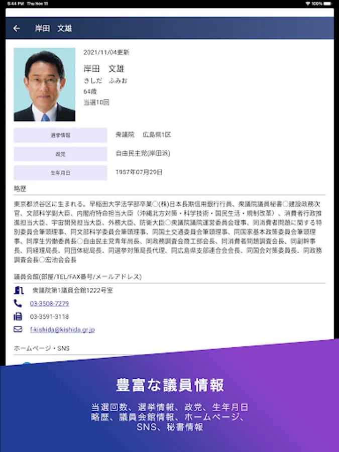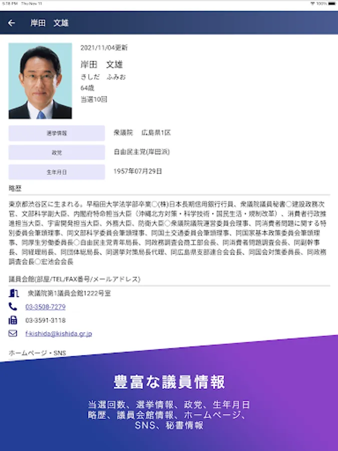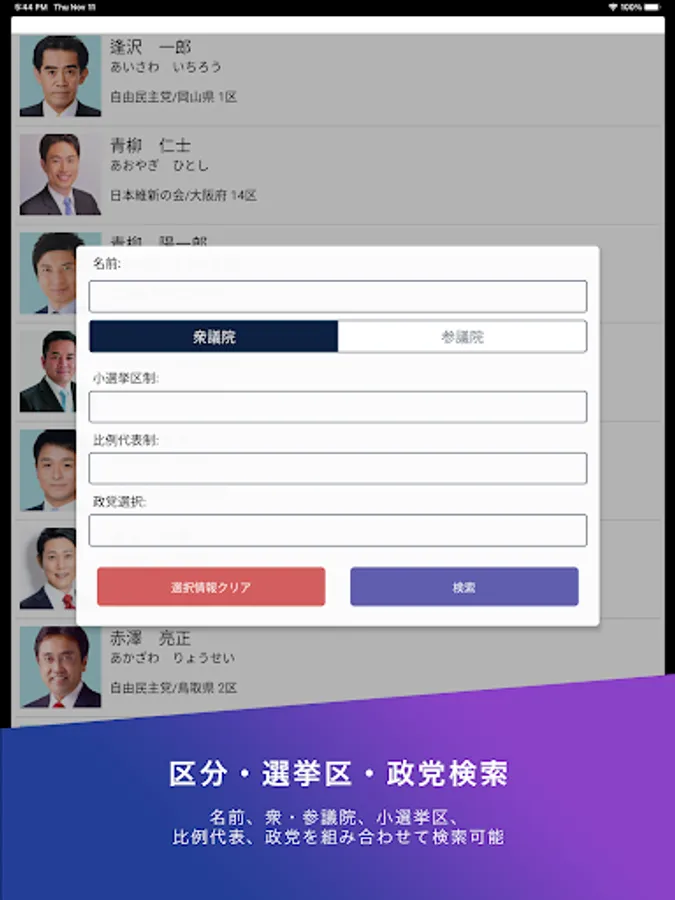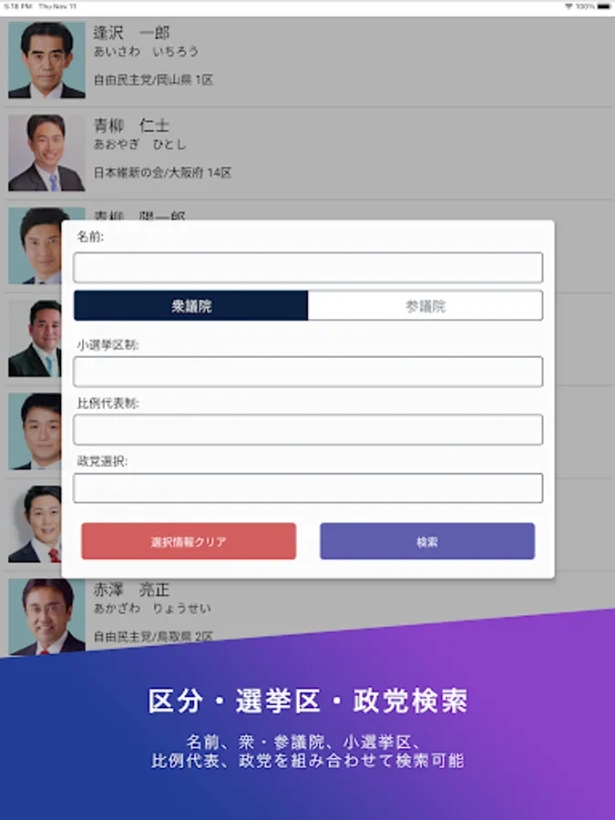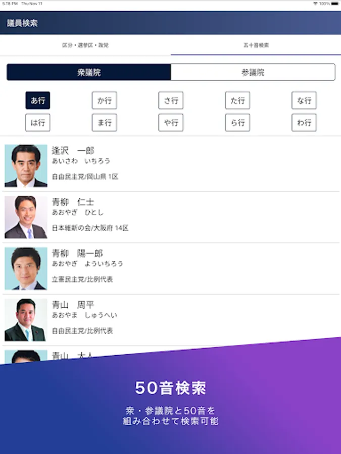 Information on all members of the House of Representatives and House of Councilors can be easily searched with this app.