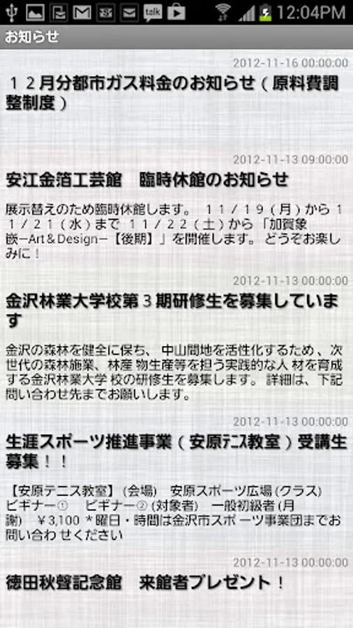 In this application, you can access news from the city of Kanazawa, such as notifications and event information .
