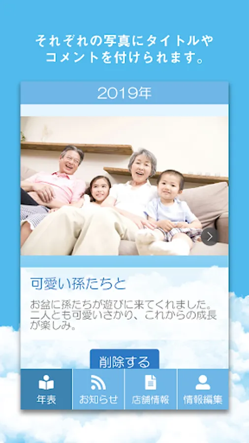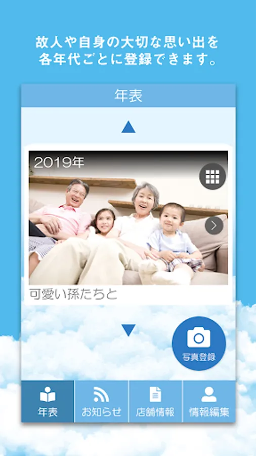 情報の登録は簡単。スマートフォンに入っている写真を選んで、年代や説明文を入力し、登録ボタンを押せば、故人史・自分史のできあがりです。