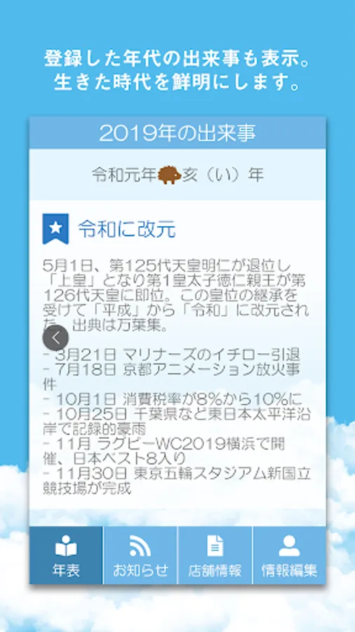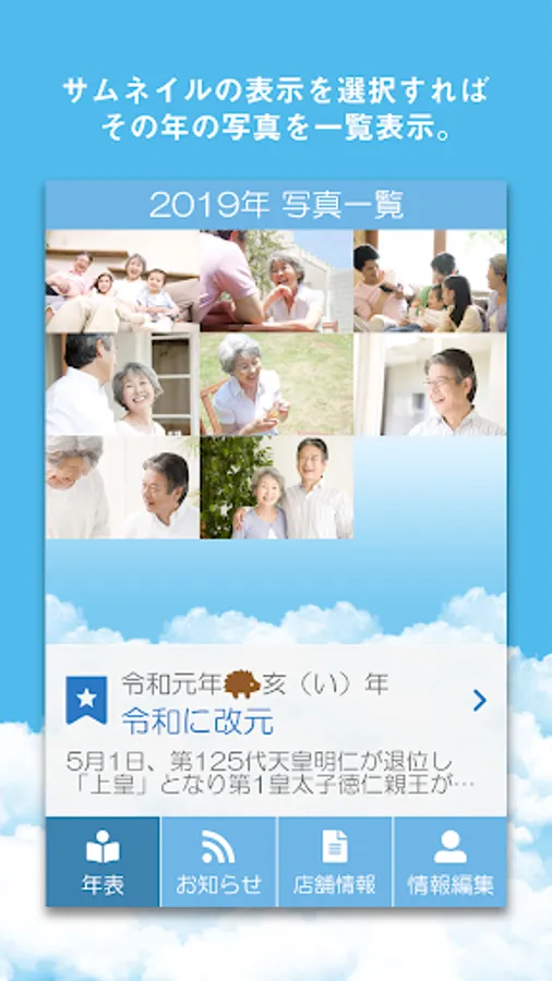 年代(1940年~現在)ごとに写真をまとめる為、その年に起きた世界の出来事も表示でき、生きた時代を鮮明に振り返ることができます。