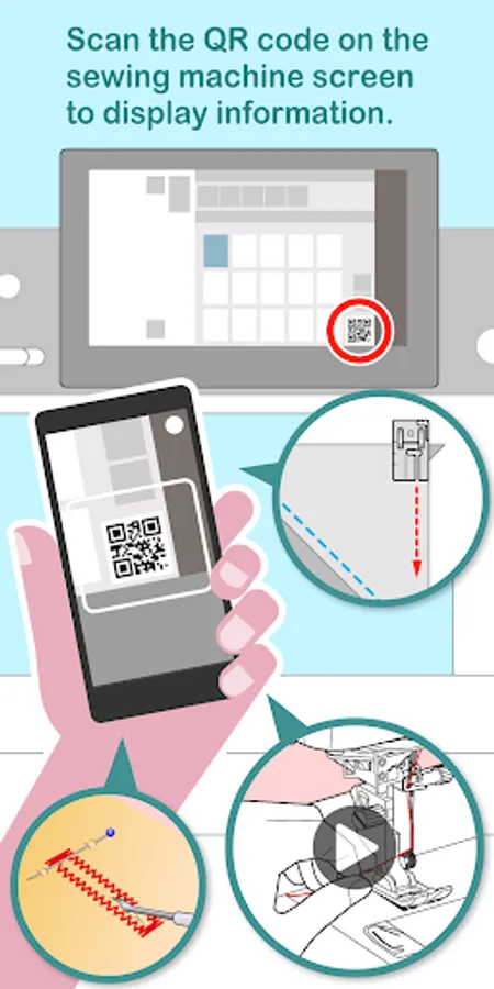 * When the QR codes displayed on the sewing machine screen are read with AcuSpark, instructions and know-how related to the status of the sewing machine appear in the app.