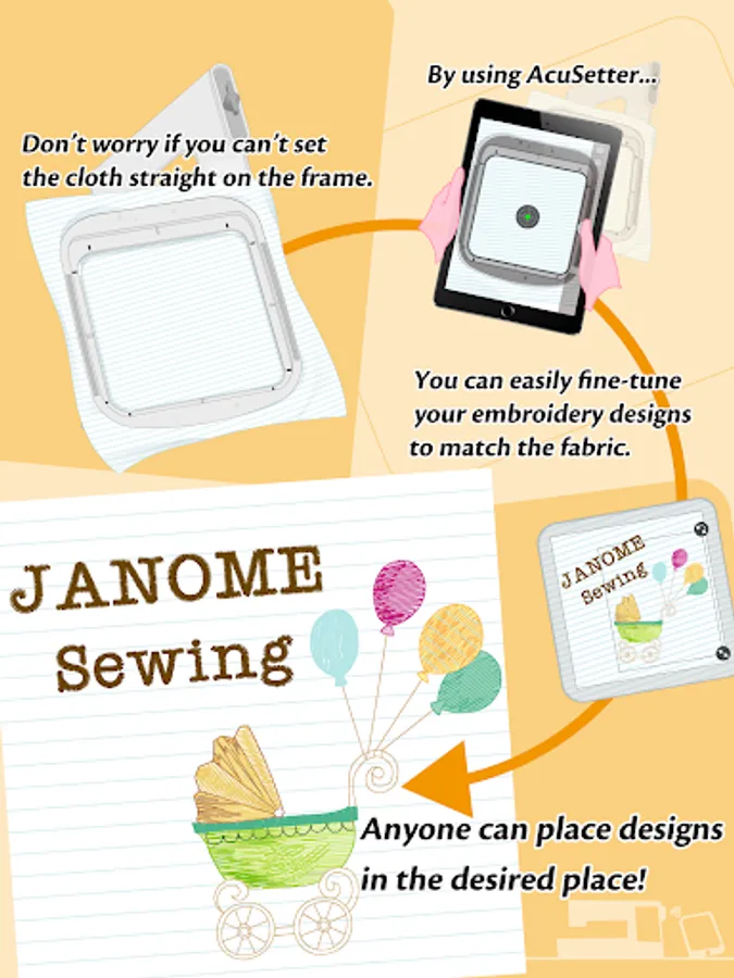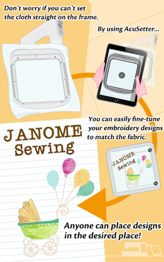 The AcuSetter app allows you to adjust the position of designs using your android tablet and Wireless LAN before embroidering. Even if the fabric shifts a little when it is inserted in the hoop, reinserting it isn't necessary.