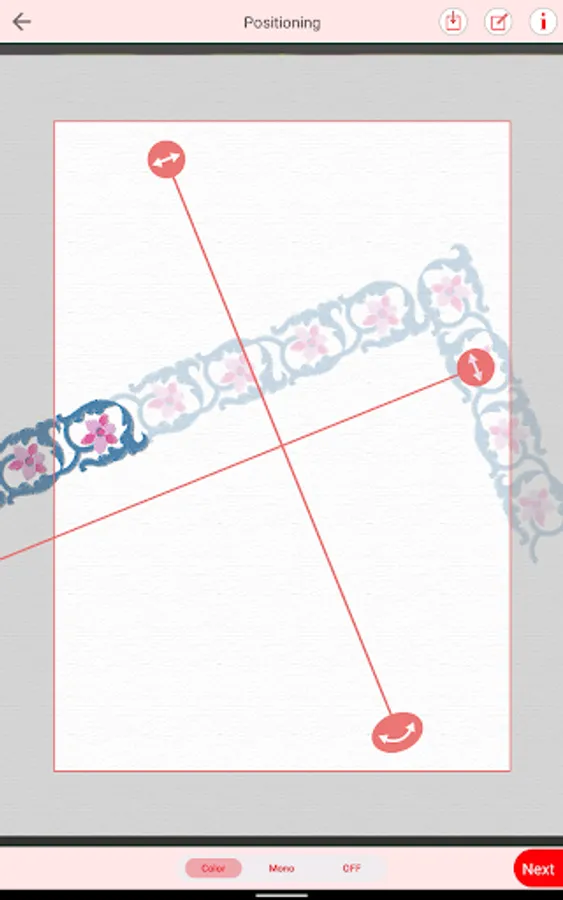 ・After receiving embroidery designs from the sewing machine's Ready to Sew mode, you can arrange the position of the designs.