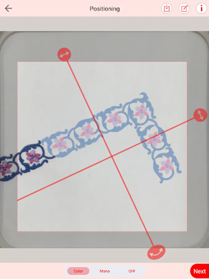 By taking a photo of the embroidery hoop with the fabric inserted in it, the design can be easily arranged while checking various fabric conditions (shifting of the fabric's position, fabric patterns, embroidery already sewn, cross lines etc.).