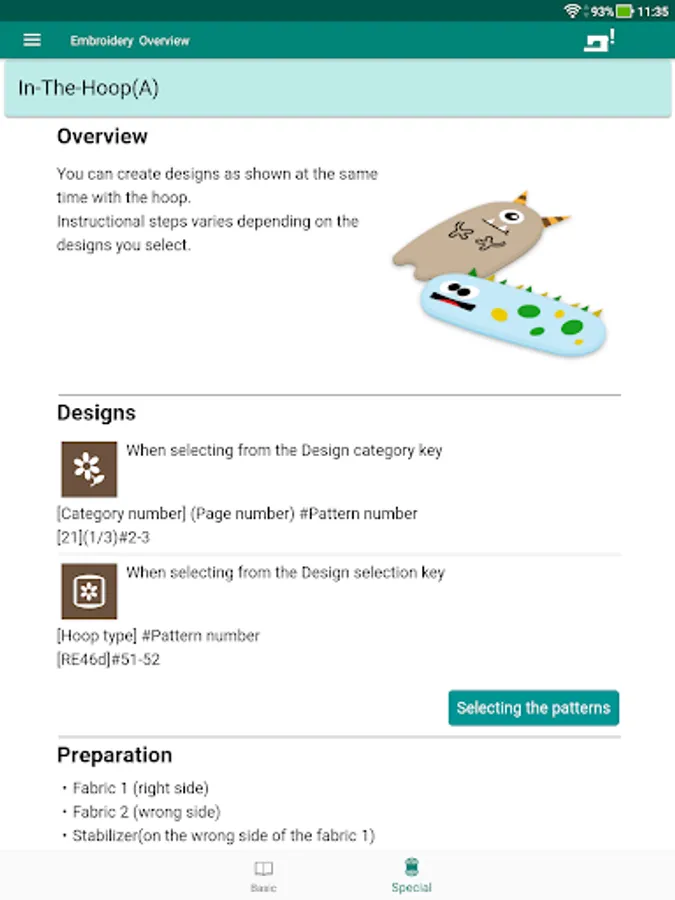* From the lists within the app, built-in stitches and designs can be selected and displayed on the sewing machine.