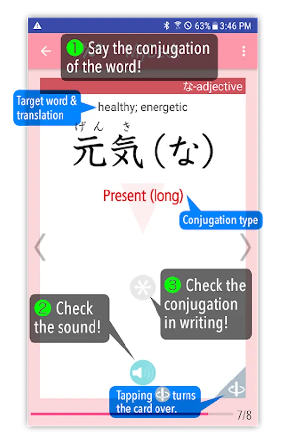 (4) Study the use of the conjugated form by referring to the example sentence and illustration on the back side of the card.