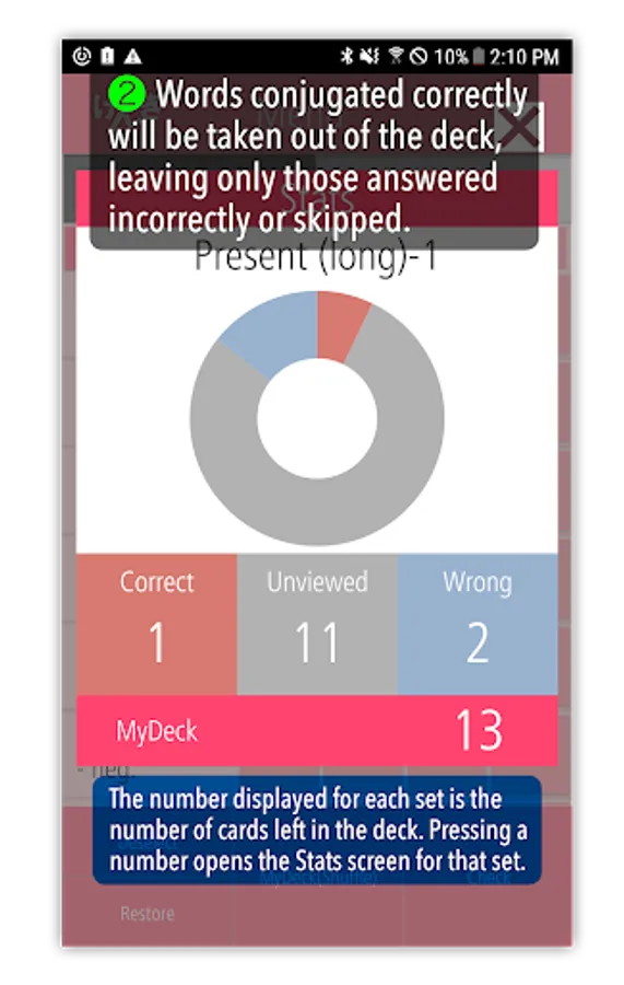 (2) If you entered the correct form, the card will be removed from MyDeck. Cards answered incorrectly or skipped will remain in the deck for further practice.