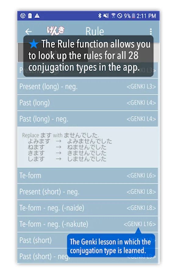 This feature lists the rules for all 28 conjugation types covered by the app, enabling you to quickly look up the way to form conjugations such as the passive, the causative, the causative-passive, and the tricky te-form.