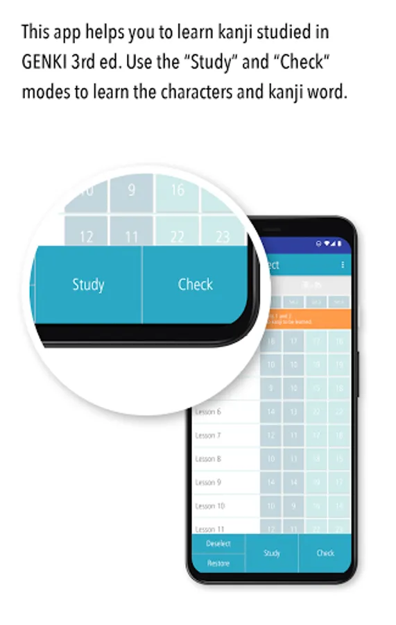 GENKI Kanji for 3rd Ed. is an app that helps users become able to recognize 317 basic kanji by studying more than 1,100 kanji words at their own pace!