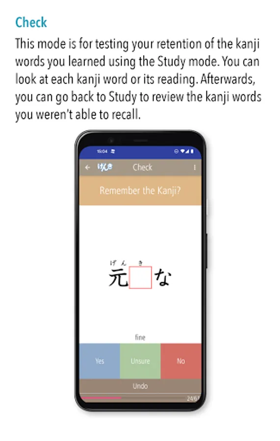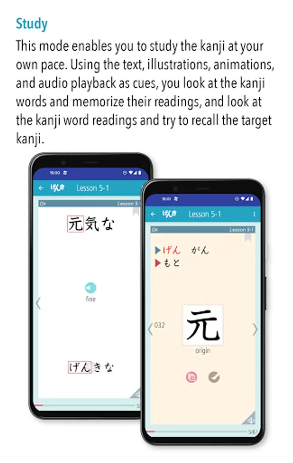 “Study” allows users to view the kanji words, their readings, and the target kanji for each word over and over, so they can take their time learning.
