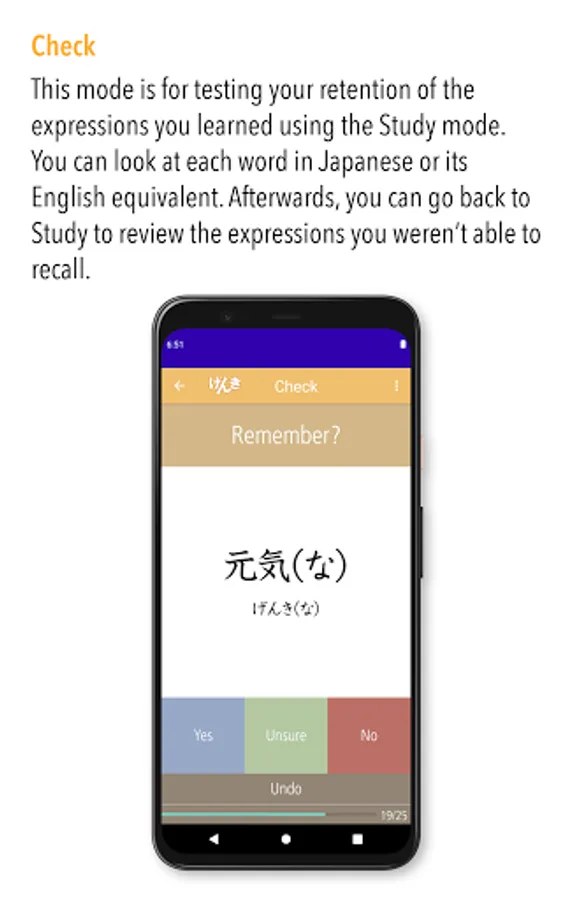 This app has three main modes: Study, Check, and List.
