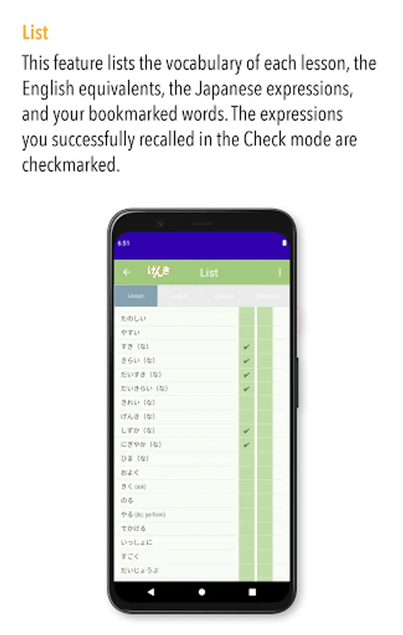 ・The list can be arranged in any of three orderings: lesson order, a-i-u-e-o order, and alphabetical order. The words bookmarked in the Study mode are also listed in the Bookmark list.
