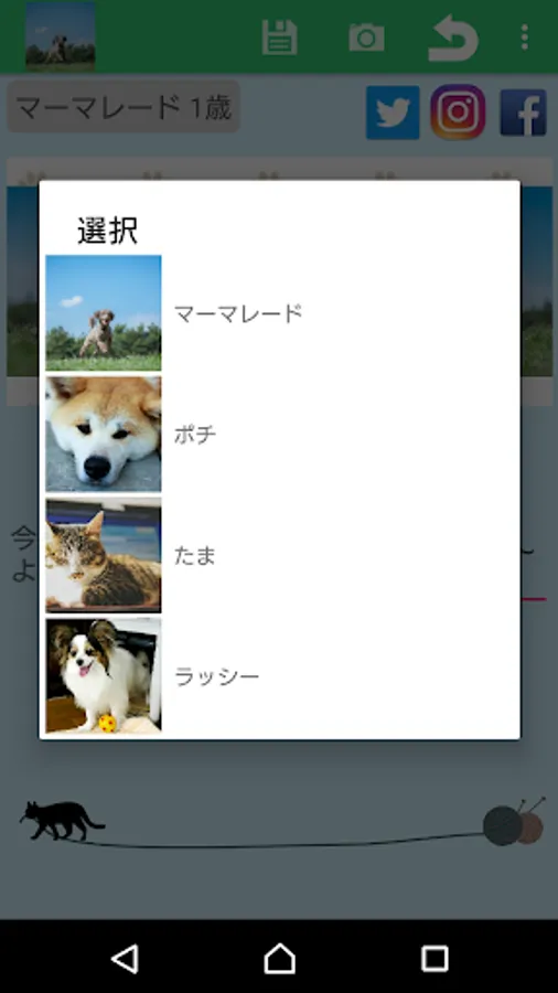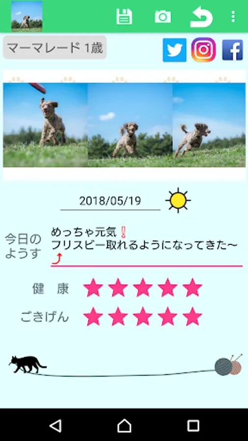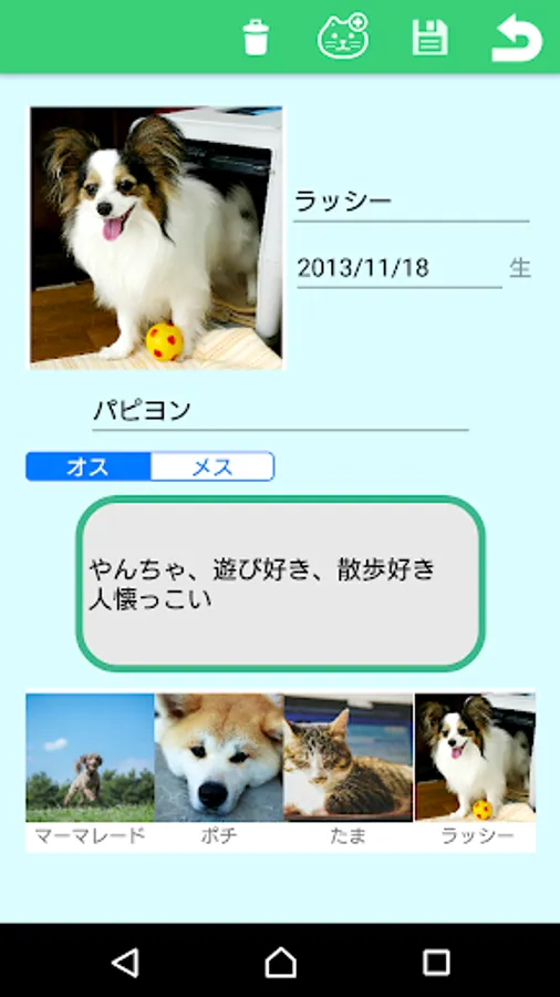 - Record of pet diary (date, today's pet, health, happy, pet selection)