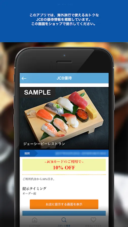 When using a JCB card, if you present the "Display the screen to present to the store" screen, you can receive discounts, gifts, and other benefits.