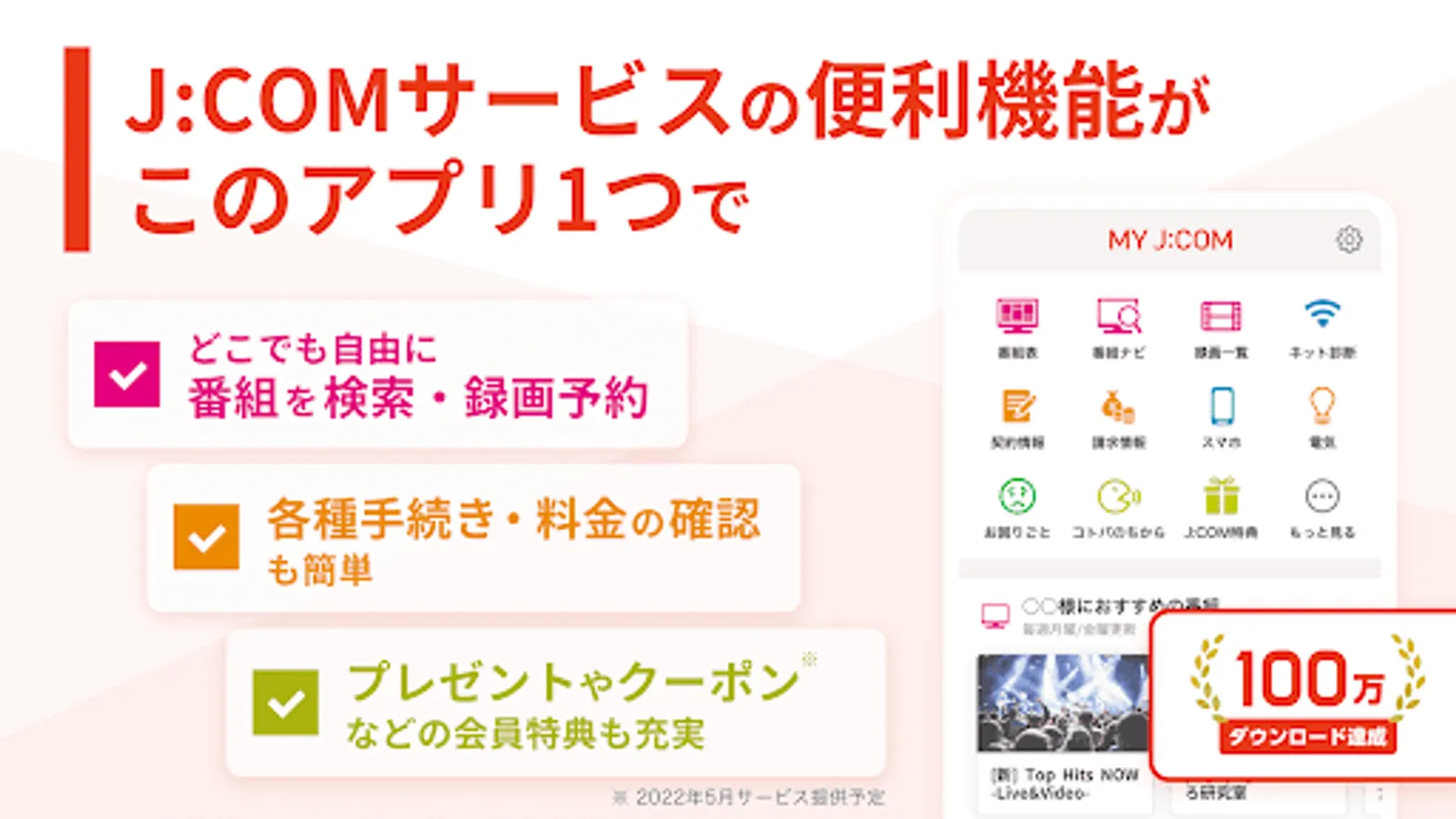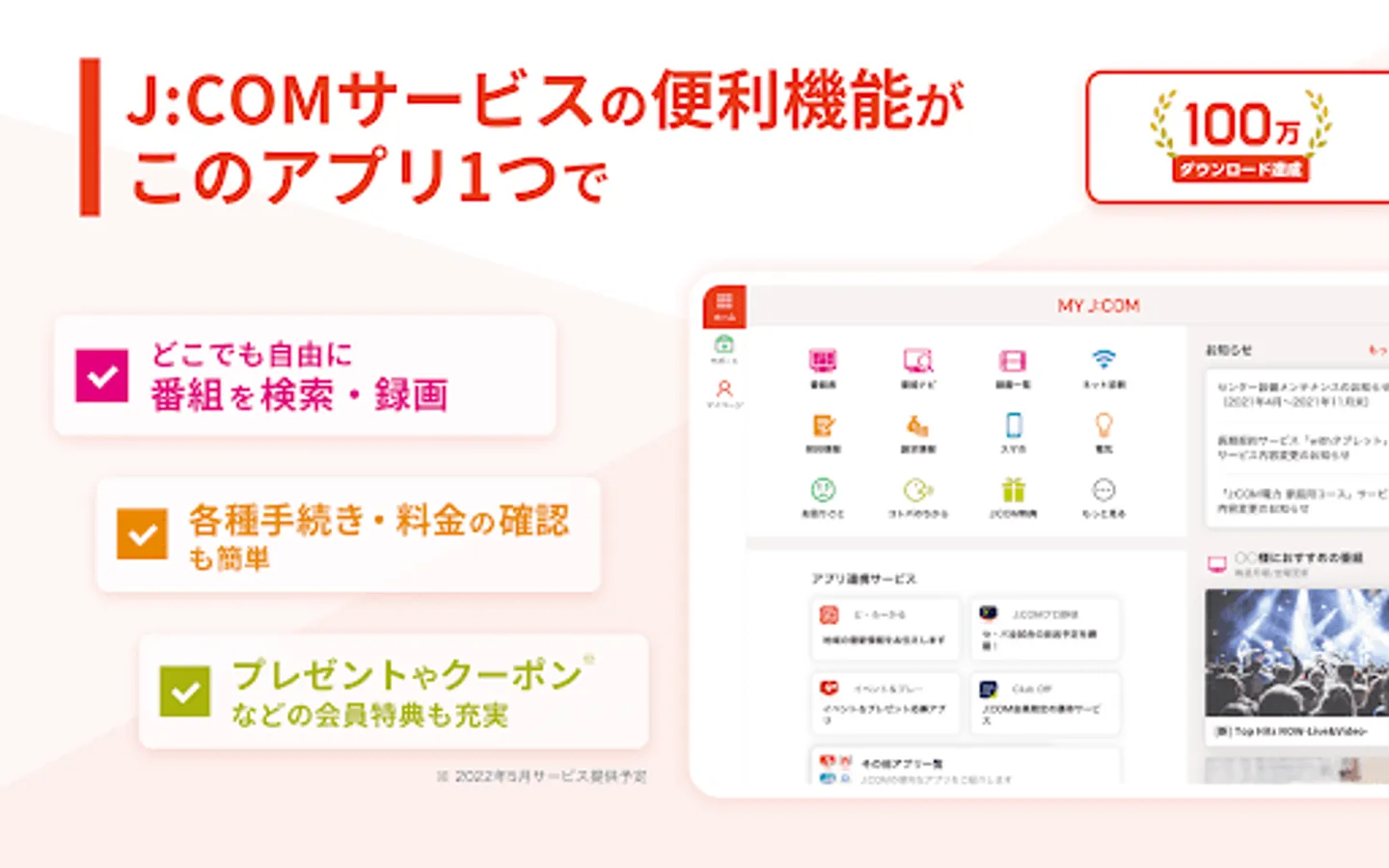 J: Combines various convenient functions such as recording reservation / viewing from outside, searching for TV program information, support for problems, confirmation of various procedures and fees, and use of member benefits such as gifts and coupons. This is a portal application exclusively for COM subscribers.