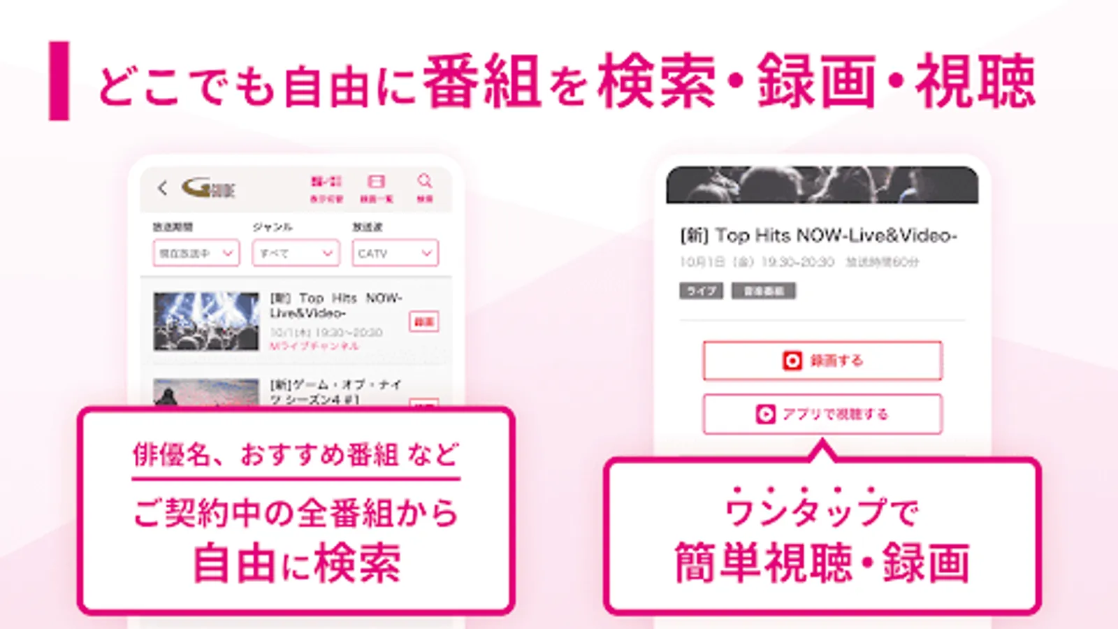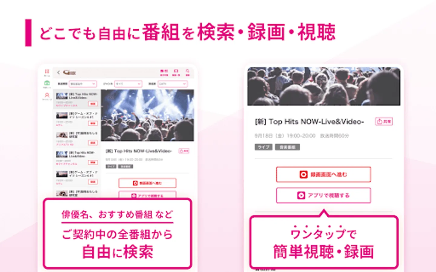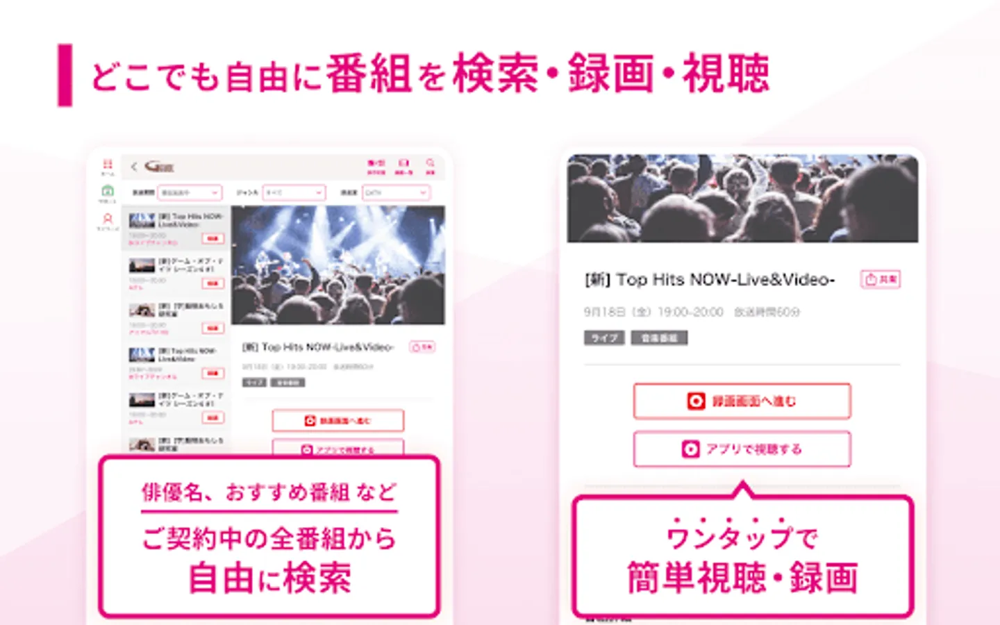 ・ Function to narrow down by genre and broadcast date ・ Program search function by free word such as performer name and program name