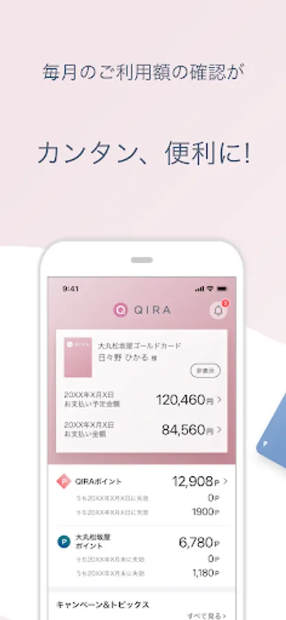 The official app of the Daimaru Matsuzakaya card. In this app, you can check QIRA [Kira] points, Daimaru and Matsuzakaya points, as well as payment amounts and campaign information.