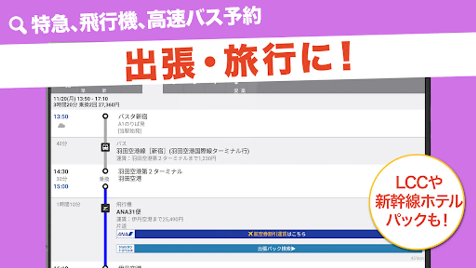 ・ You can make online reservations for flights, bullet trains, limited express trains, high-speed buses, and accommodations that are convenient for business trips and travel.