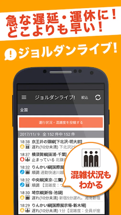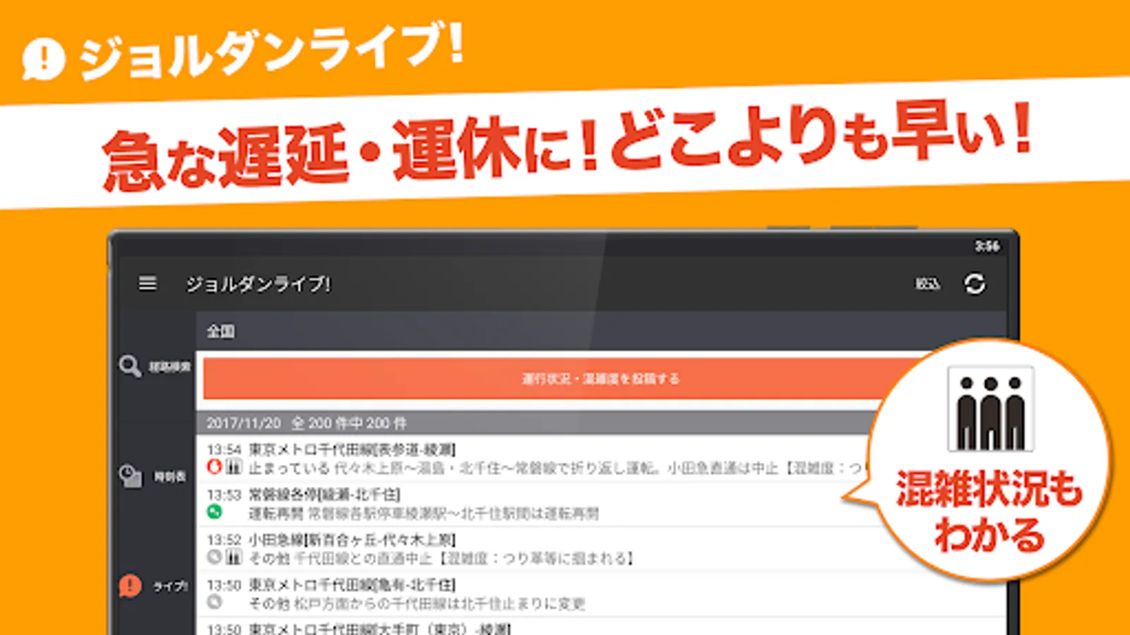 ・ Because it is information posted by local users, it is faster than anywhere else! You can quickly find out about sudden delays, suspension of driving, suspension of operations, and congestion. You can narrow down by area, route, and situation.