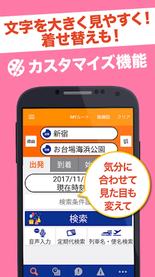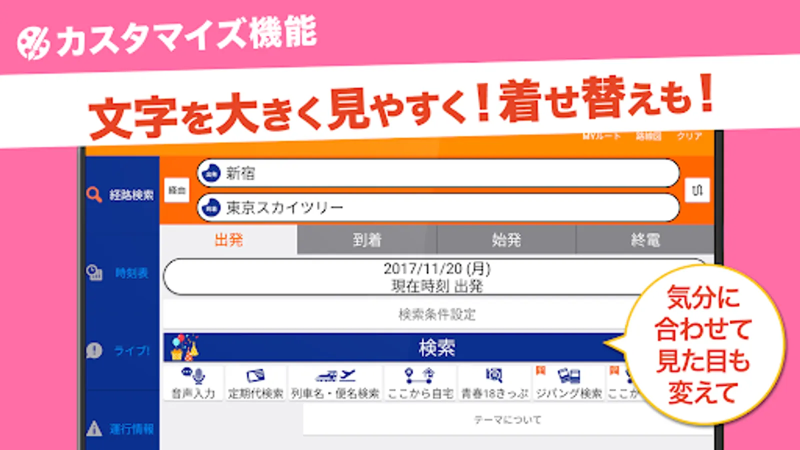 -A "theme" that increases the size of characters and makes transfer guidance cute, and a "customization" that allows you to select the functions and items to be displayed in the route search results and make them look easy to use.