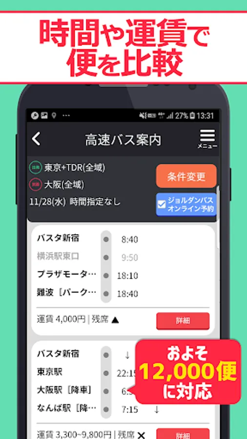 発着の都道府県や地域、出発日/時間帯などを指定して、およそ12,000便以上の高速バス便から検索ができます。