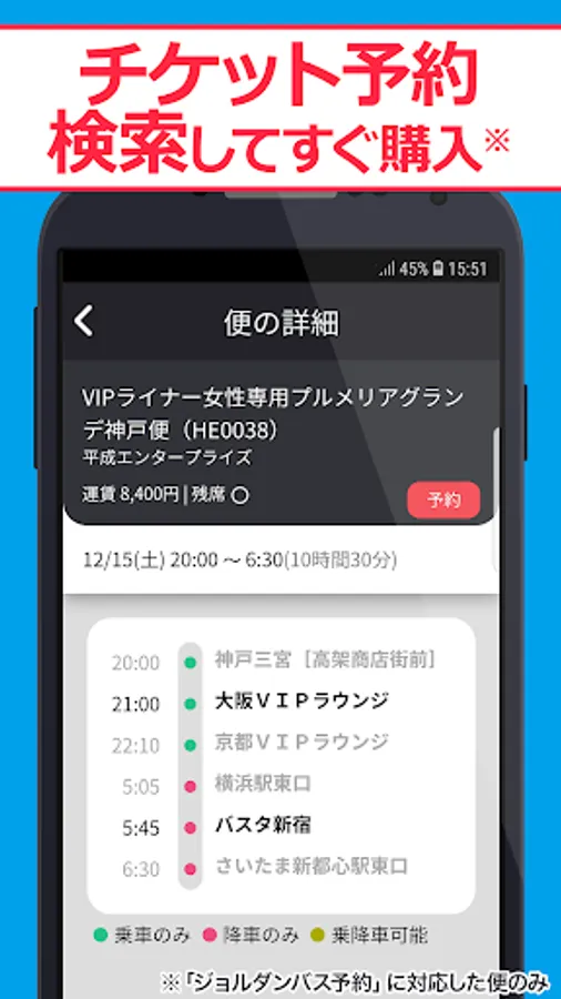 『ジョルダンバス予約』に対応している便であれば、検索結果からチケットの予約・購入をかんたんに行えます。