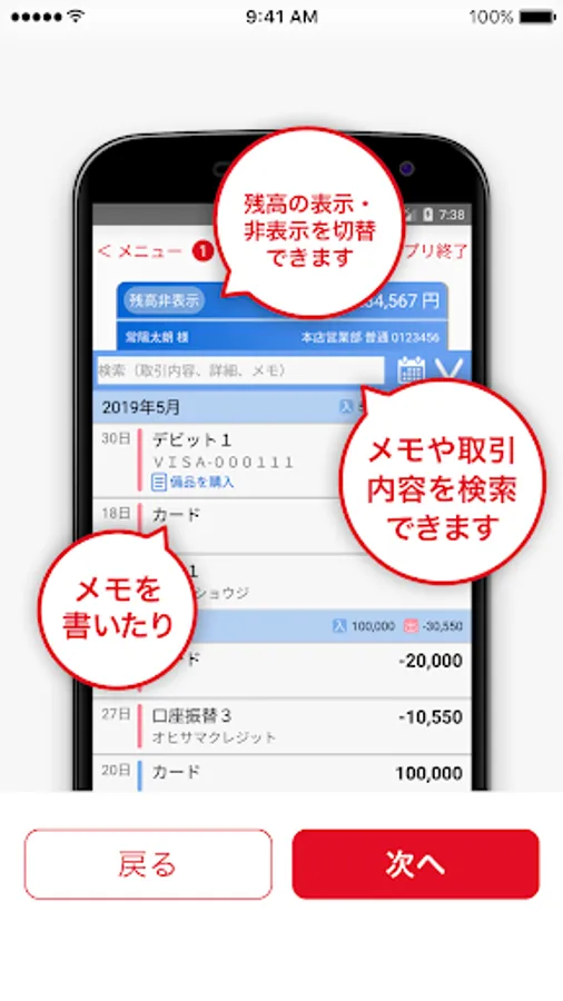 From the smartphone you can see "deposit balance" and "deposit / withdrawal details", "anytime anywhere · easily". You can leave a memo of up to 100 letters for each statement, so you can search by the contents of the transfer place and the memo so you can use it conveniently as a substitute for the passbook.