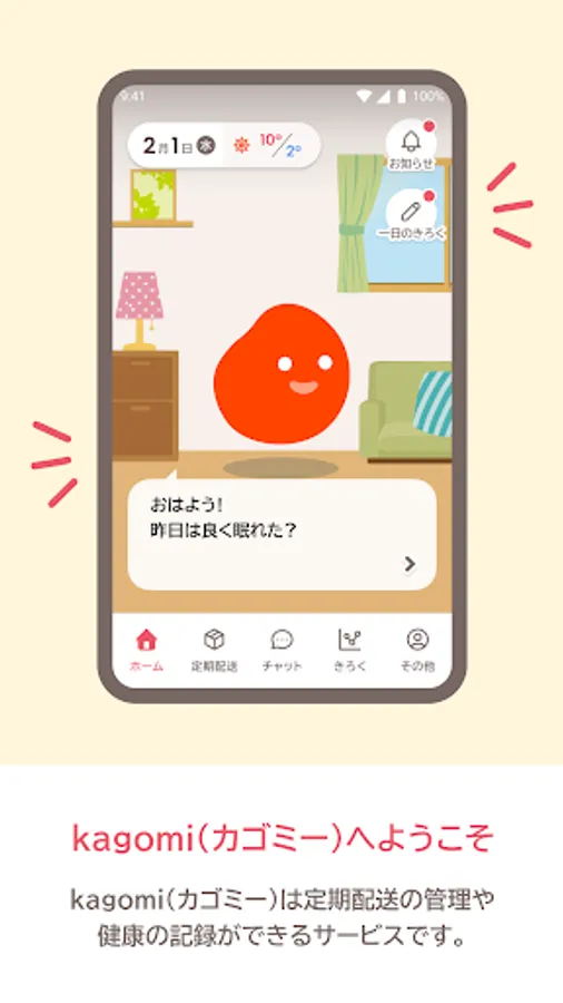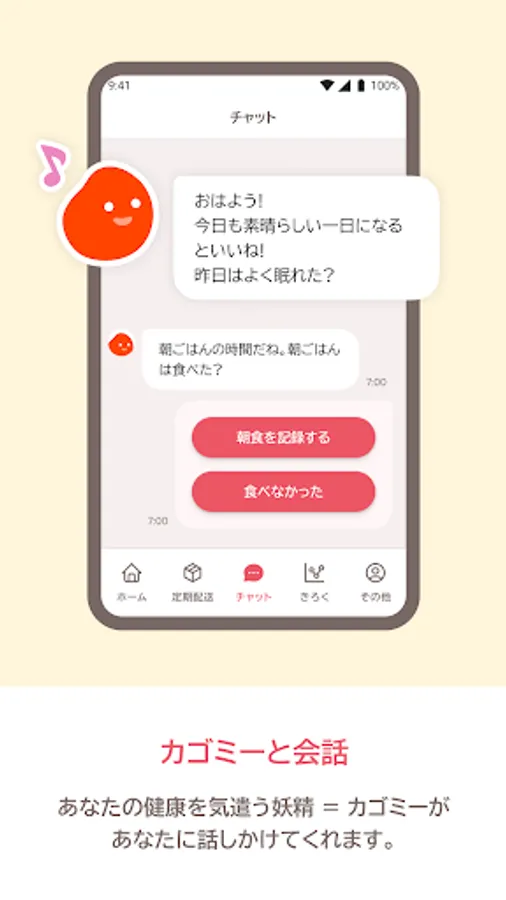 チャットで話しかけてくるKagomiと会話するだけで、食事・運動・お通じ・睡眠の記録がとれます。会話形式でライフログをつけられて簡単。続ければKagomiが成長して会話も増えるので、毎日の健康習慣が楽しくなります!